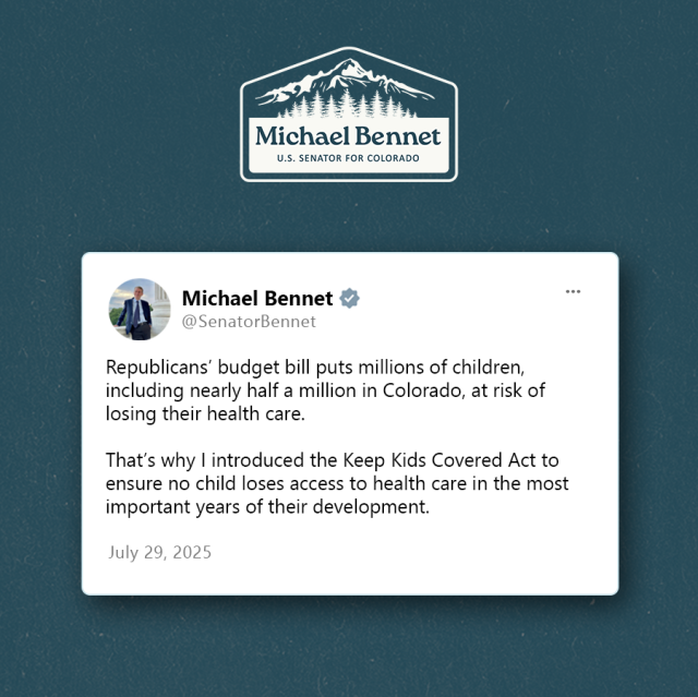 What’s happening: The Republican “One Big Beautiful Bill Act” will cut $1 trillion from Medicaid and CHIP. This includes an estimated $14 billion in federal funding for Medicaid in Colorado, with rural communities estimated to lose $1.9 billion. This legislation puts millions of children at risk of losing their health care, including nearly half a million children in Colorado.